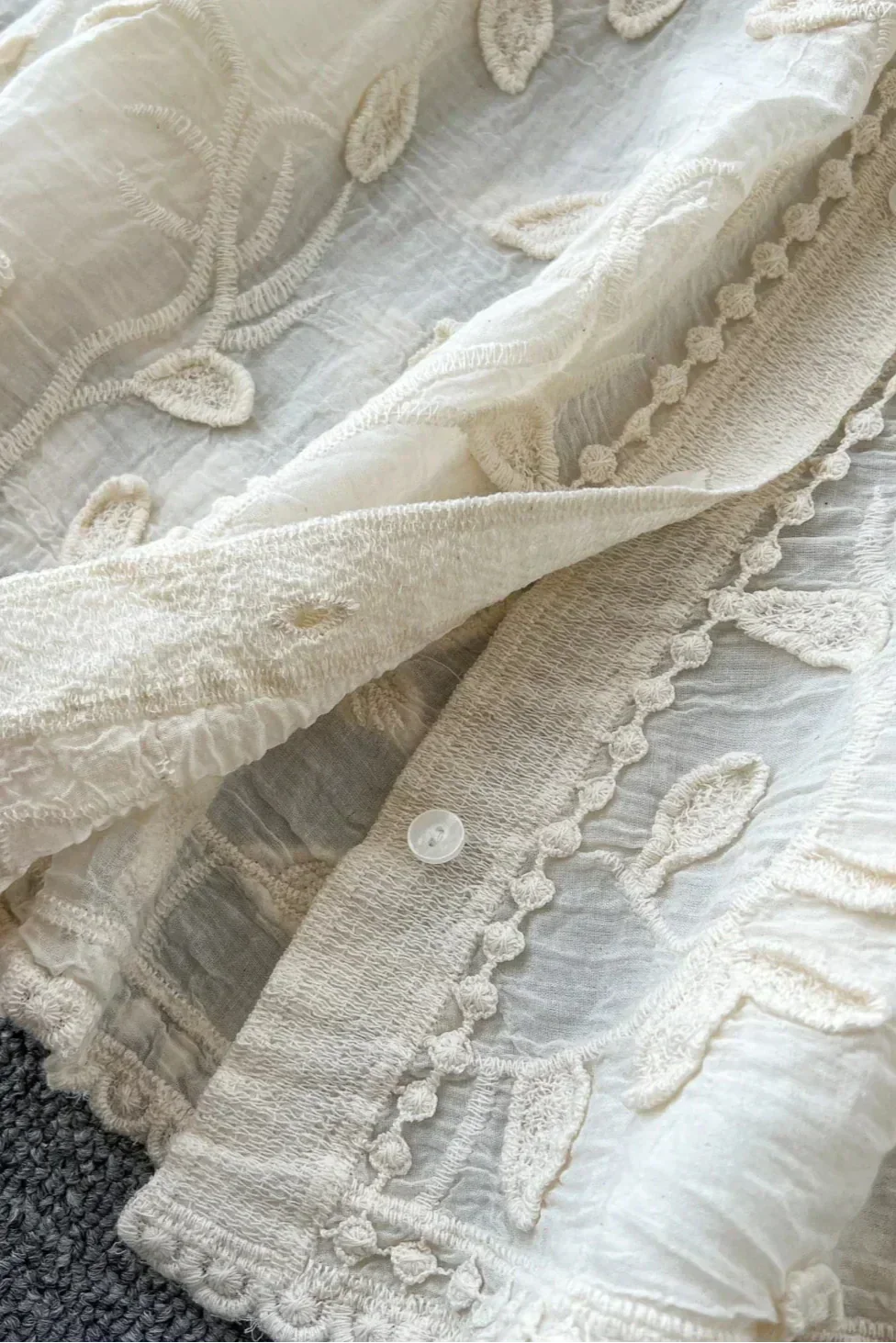 Ligera, elegante y llena de encanto poético—la Camisa Prairie combina encaje transparente con delicados bordados de hojas para un look que se siente tanto atemporal como único. Terminada con sutiles botones en tono dorado, es una declaración de suave sofisticación—perfecta para un estilo en capas de día a noche.